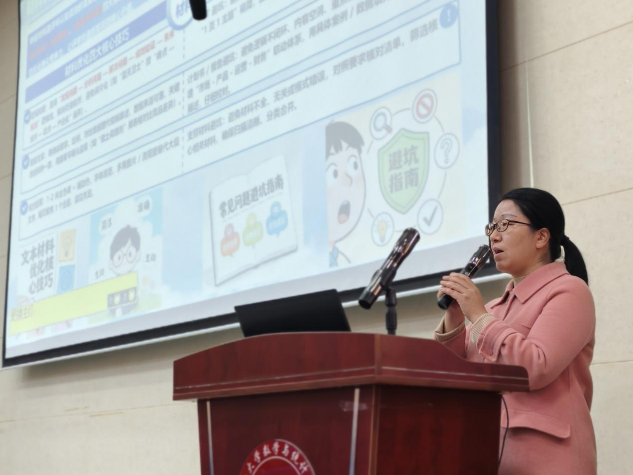会上,今年荣获“挑战杯”全国大学生课外学术科技作品竞赛揭榜挂帅赛道国三的学生代表金婷分享了宝贵的一线参赛经验。她从团队组建、分工协作、时间管理到临场应变等方面,生动讲述了备赛过程中的心得体会,并提醒同学们重视细节打磨与心态调整,为在场同学提供了极具参考价值的实战指导。