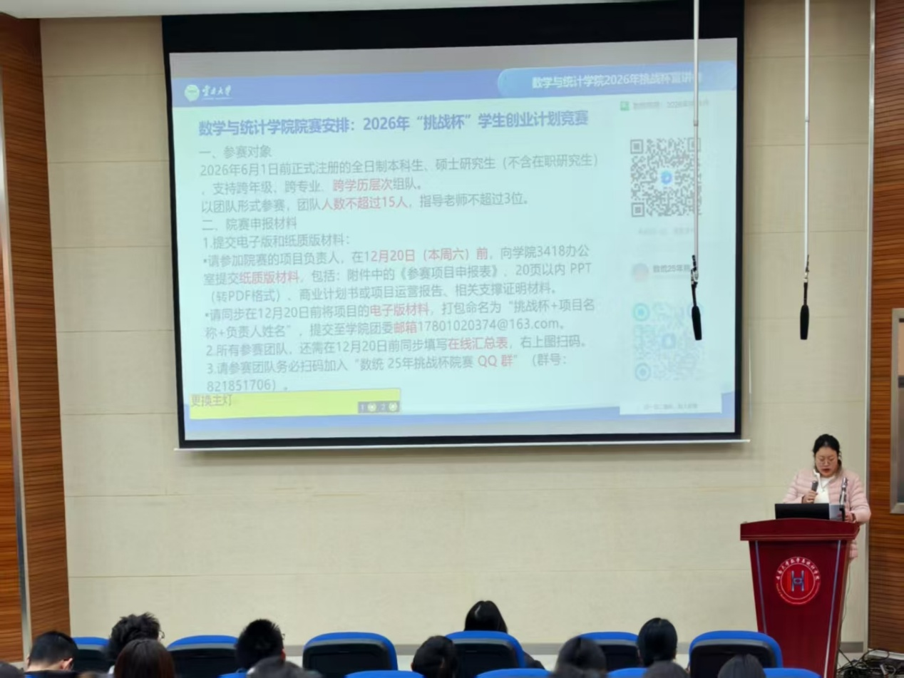 两位教授结合多年“挑战杯”赛事指导经验,围绕选题方向、项目打磨、申报书撰写、答辩技巧等核心环节展开了系统讲解。他们指出,“挑战杯”赛事高度注重项目的创新性、科学性与实践性,鼓励数统学子充分发挥数学建模、数据分析等专业优势,在数字经济、乡村振兴、生态环保等国家战略领域寻找项目切入点,同时要注重项目落地的可行性,做到学以致用、务实创新。